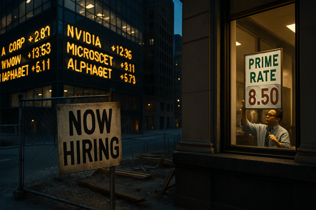 The S&P looks like a referendum on AI because the rally has been led by a small club of AI‑linked giants. Concentration makes a composite index feel like a vote on the technology itself, even when most companies are living in a higher‑rates world with ordinary margins and ordinary borrowing costs. That’s the misdirection: an AI‑powered price boom sitting atop a broad economy digesting the bill for tighter money. The juxtaposition reads as “AI up, jobs down,” but what you’re really seeing is “expectations up, financing conditions down.”